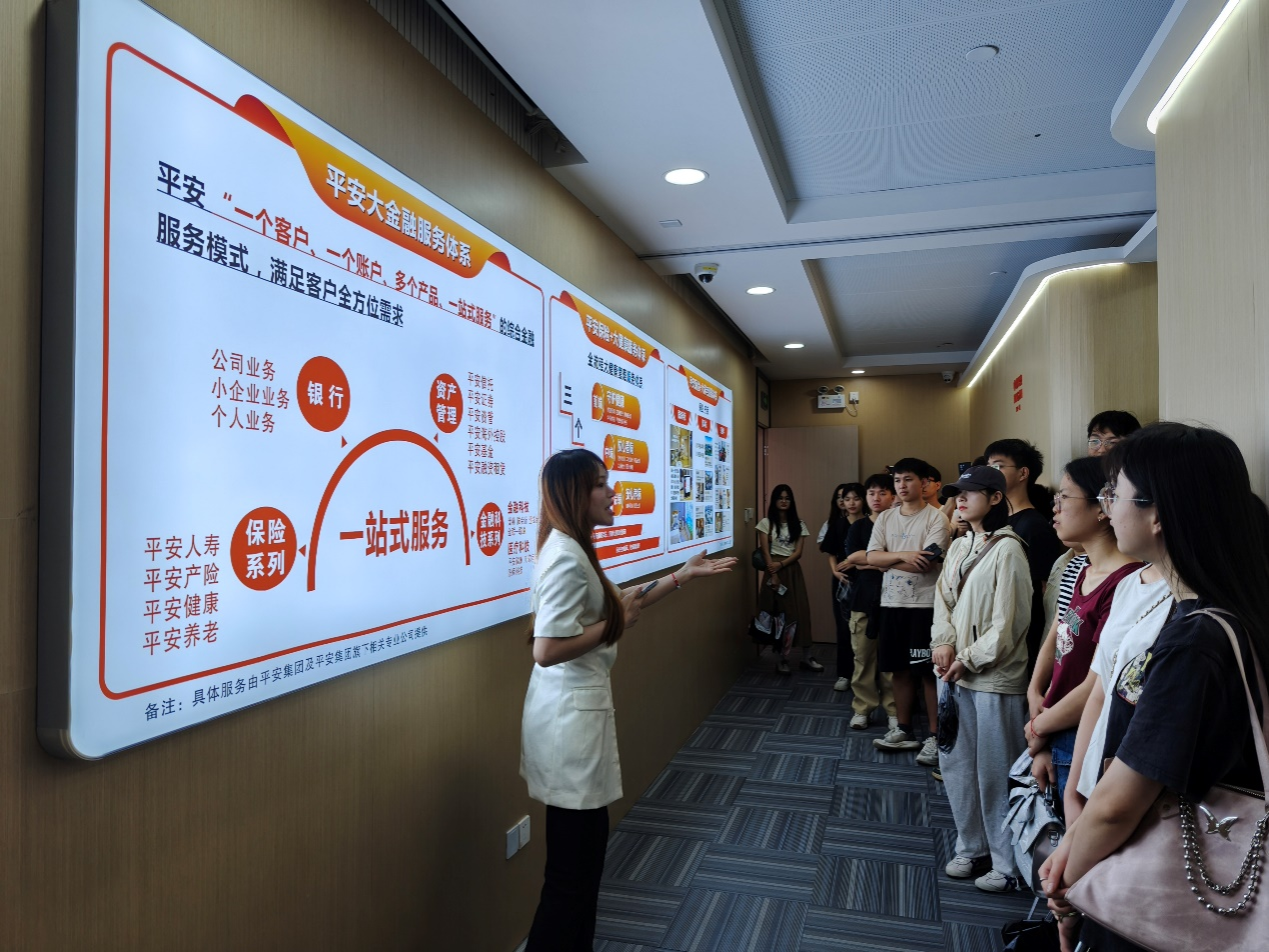 第三站,师生们来到中国平安广西分公司。该公司的讲解员为同学们详细介绍了“平安大金融体系”和“平安保险+大健康服务体系”的知识,带领大家参观“居家养老”项目样本间,亲身体验平安公司在养老权益服务方面的创新和优势。通过本站的参观学习,同学们对保险业的前沿发展有了更深入的认识,对数字化转型、科技赋能等新趋势有了更直观的感受。