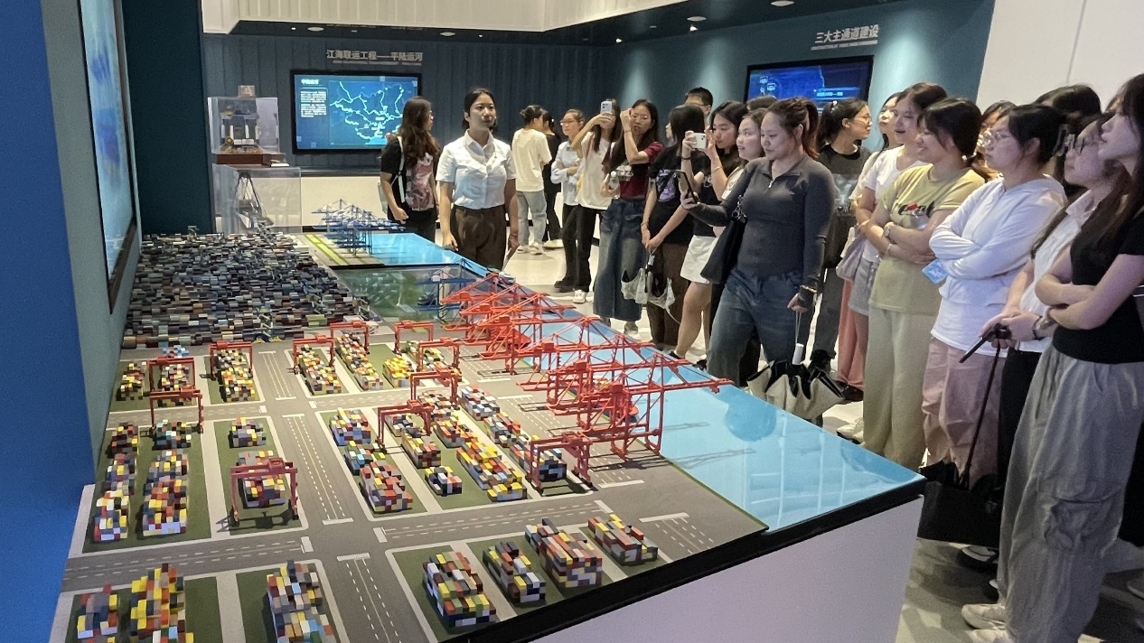 第一站,见习队伍来到广西北部湾国际港务集团有限公司西部陆海新通道北部湾港展厅。展厅丰富的展示内容让同学们了解了西部陆海新通道的发展历程、建设蓝图和通道建设等相关知识,观摩了广西在高水平共建西部陆海新通道中的新举措和新成效。同学们深刻感受到广西在推动区域经济合作和发展中的重要角色及广西在国家发展战略中的重要地位。