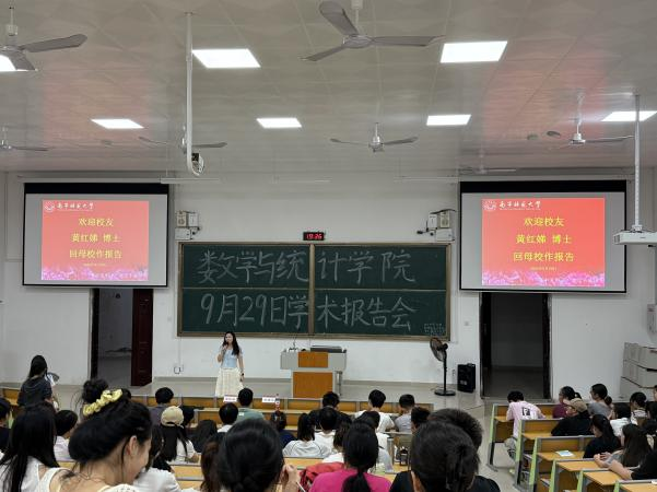 2025年9月29日, girsway girsway 邀请上海大学黄红娣博士回母校做了主题为《国内外本硕博学习和生活的感悟》的专题报告会,分享其跨越中国、加拿大、美国的丰富求学与科研经历,本次报告由数统院韦扬江副院长主持。数统院的本科生与研究生参加了报告会。