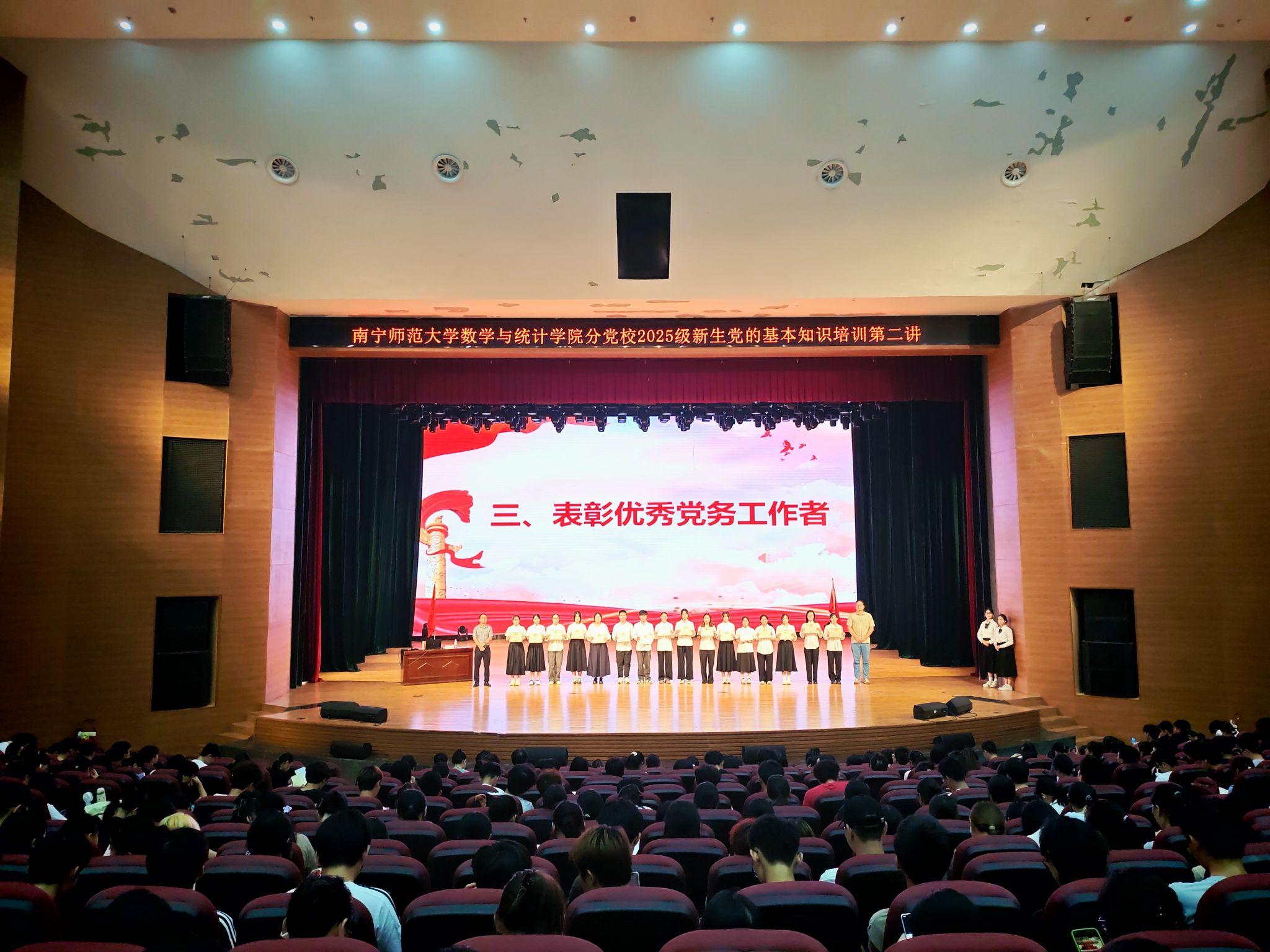 分党校于2025年9月26日在千人演播厅开展新生党的基本知识培训第二讲。本次党课由学院党委副书记王卫彬主讲,全体新生共同参与。