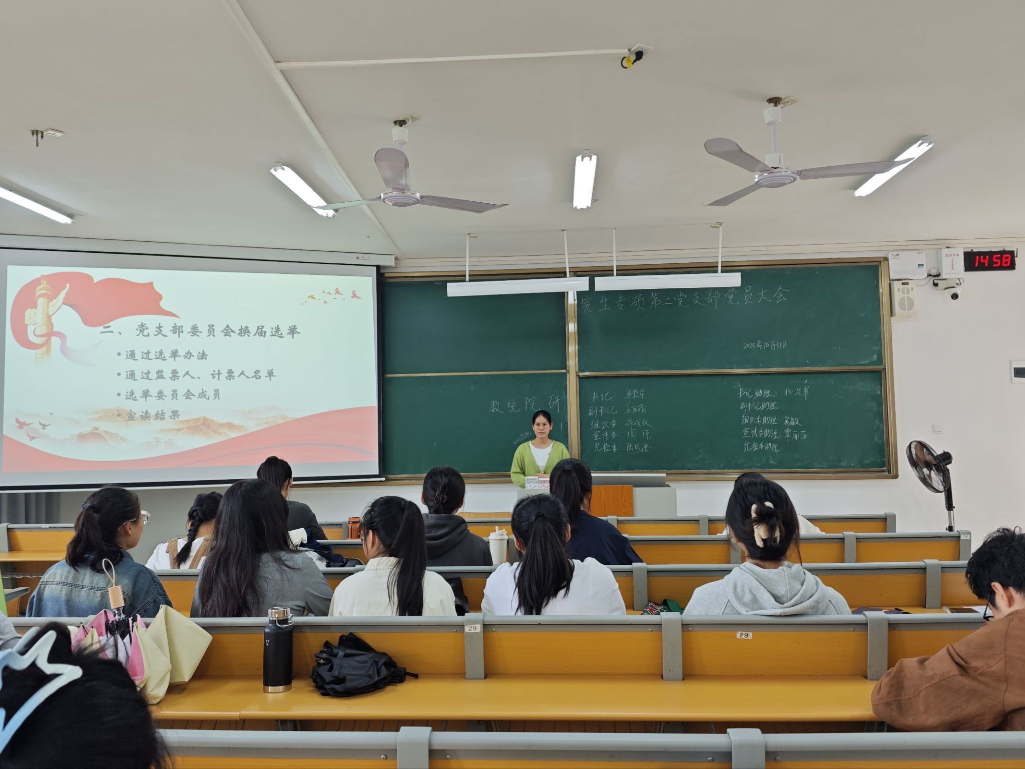 研究生专硕第二党支部党员大会如期举行,核心议题为支部委员会工作报告审议与换届选举工作。全体党员严格遵守会议纪律,以严肃认真的态度全程参与。