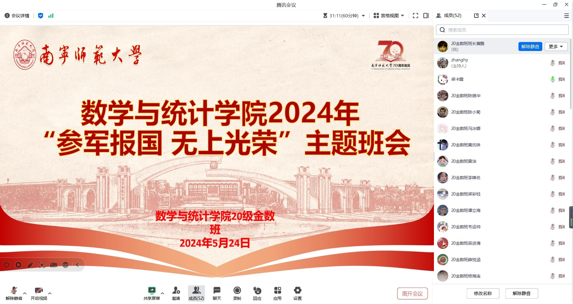2020级各班通过线上线下结合的方式开展应征入伍宣讲主题班会,本次班会由各班班主任主讲,2024届各班学生参加了本次征兵主题班会。