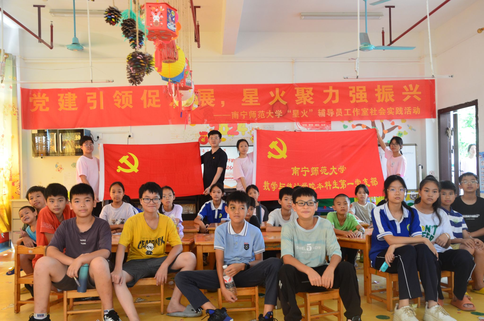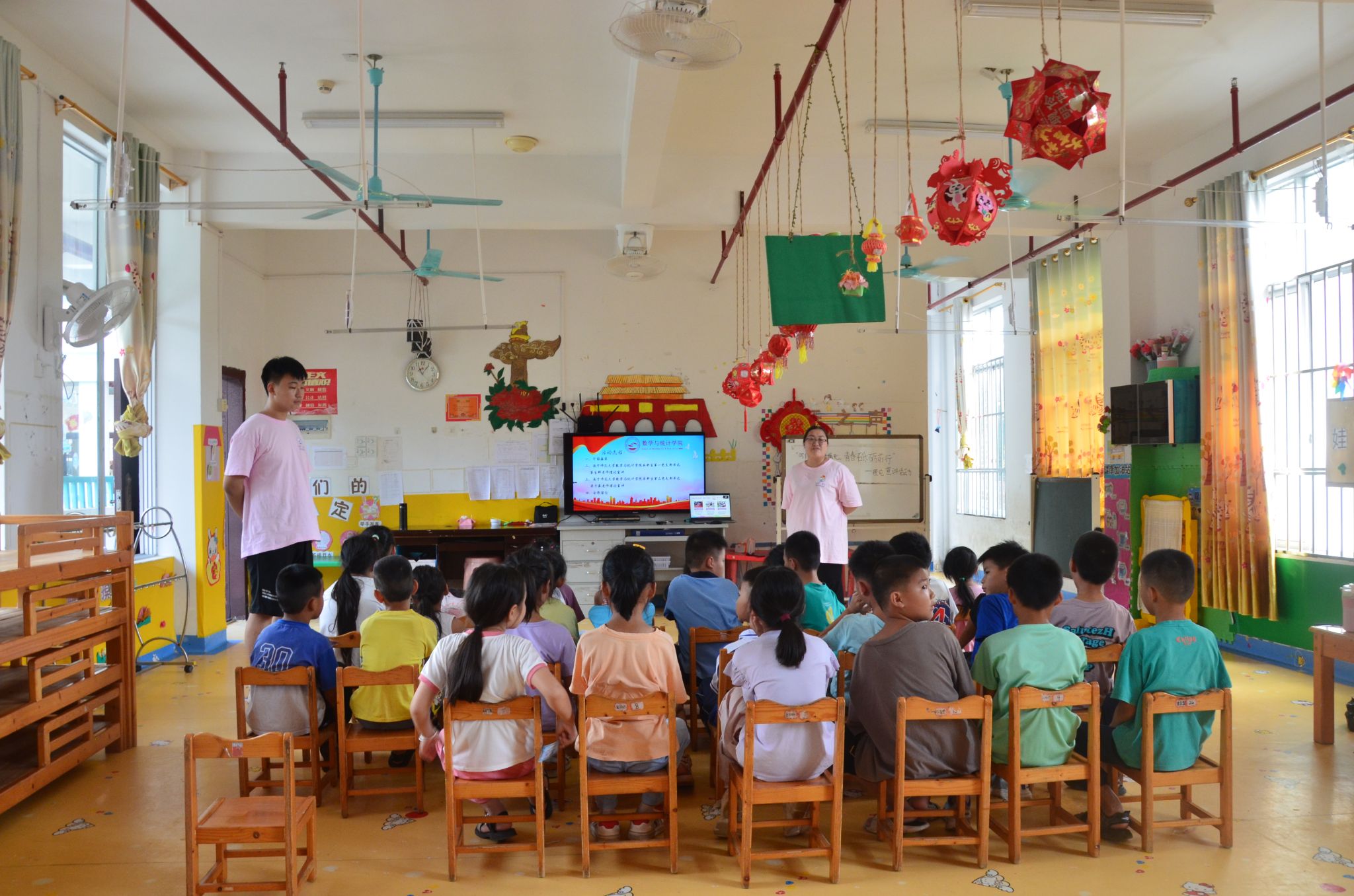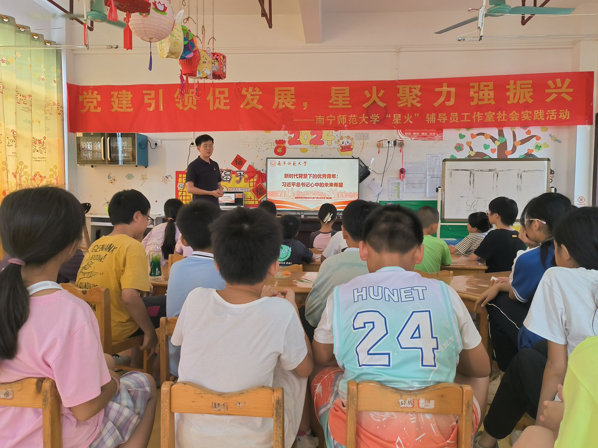 2024年大学生暑期“三下乡”社会实践活动“澎湃·朋π”实践服务队在南宁市武鸣区马头镇中心幼儿园开展了以“时代殷殷嘱托,青春砥砺前行”为题的理论宣讲活动。本次活动邀请了学院本科生第三党支部书记、暑期“三下乡”带队老师梁卡霖和本科生第一党支部书记第生辉老师担任宣讲人。