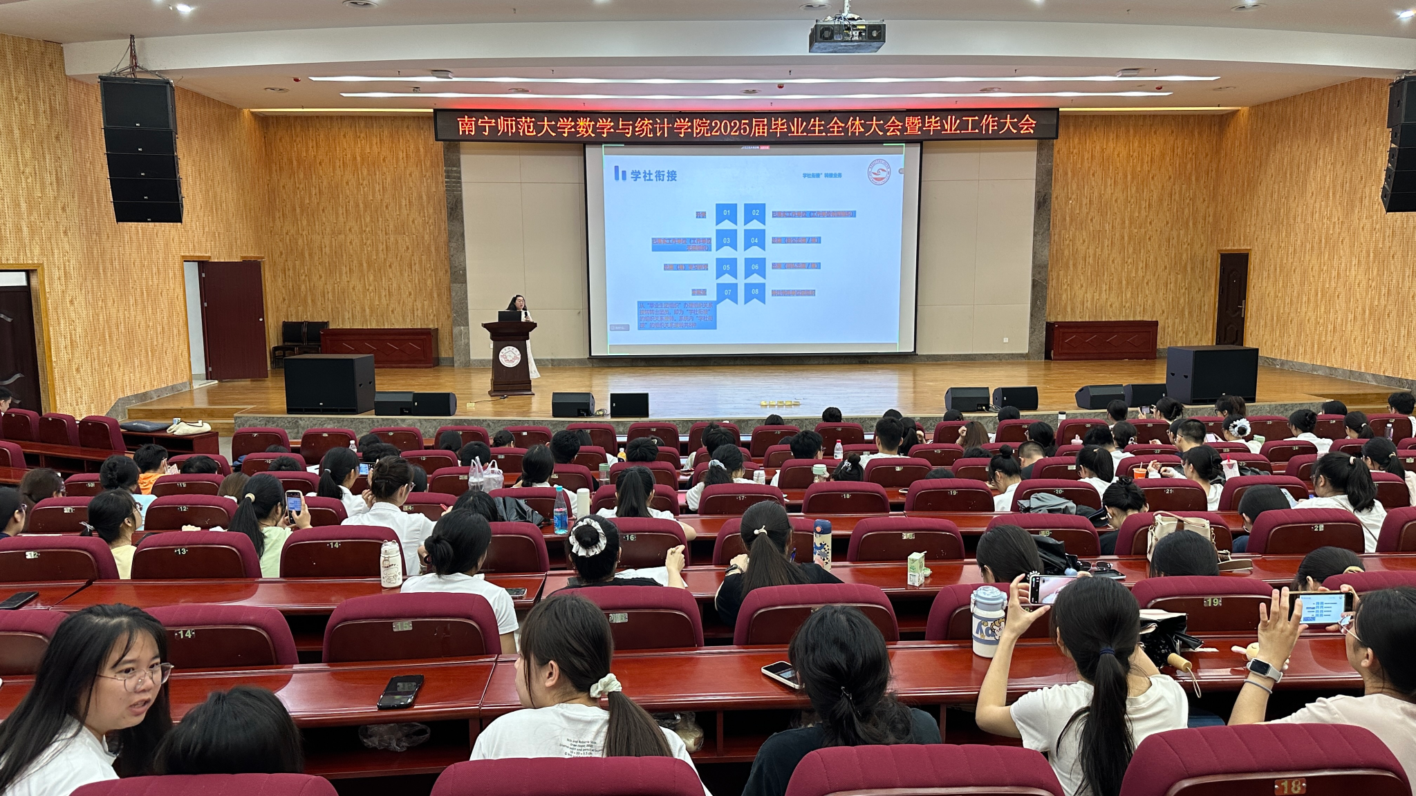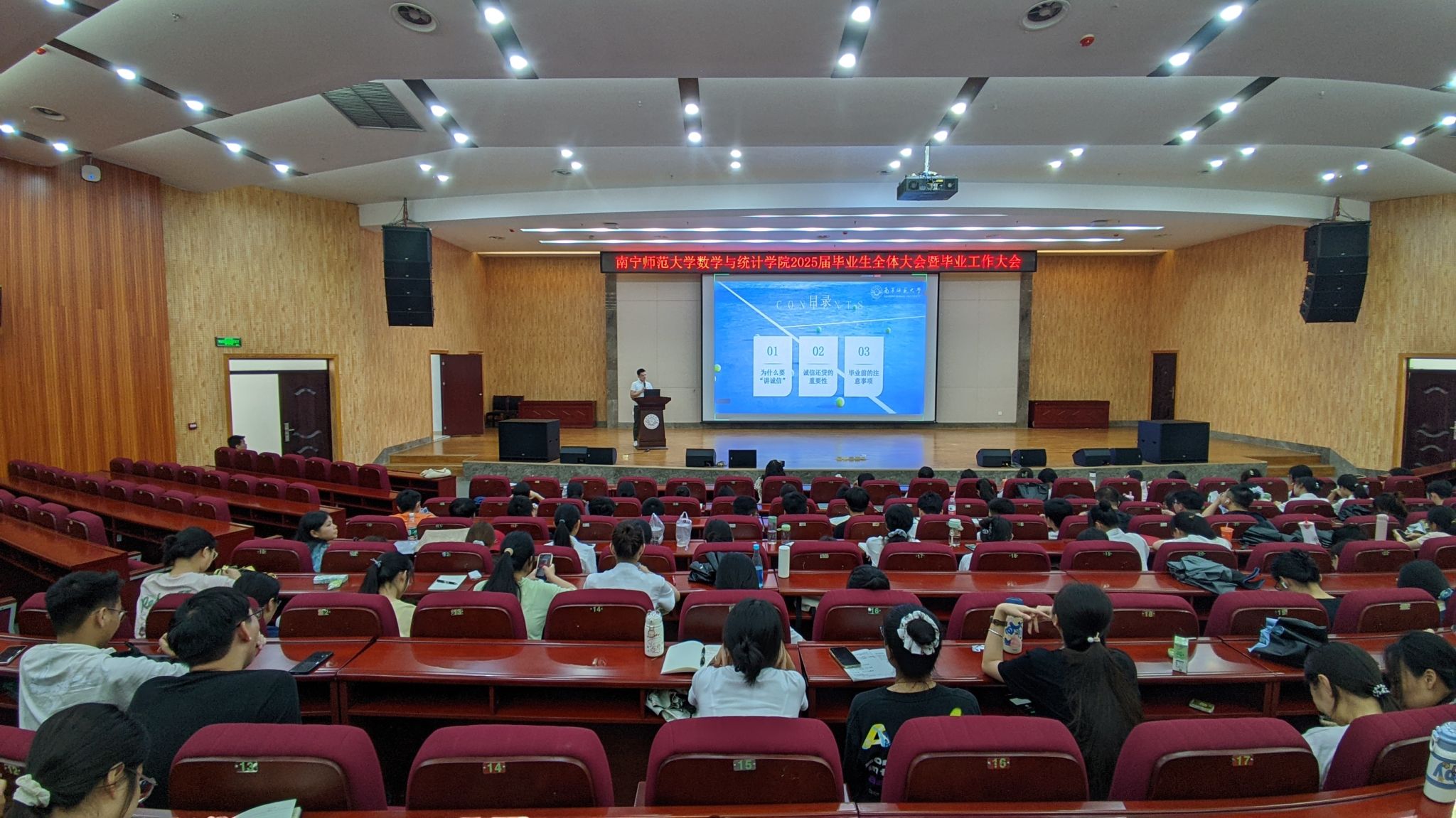 在武鸣校区图书馆报告厅召开2025届本科毕业生工作大会,学院辅导员老师、在校毕业生参加此次大会,学院团委书记梁卡霖老师主持。