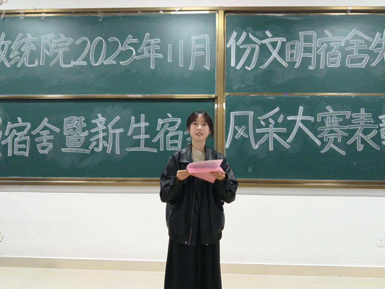 在武鸣校区二号教学楼121教室召开2025年11月份文明宿舍、先进党员宿舍暨新生宿舍风采大赛表彰大会,学院辅导员方安琪、团委副书记龚雅雯、常务副秘书长彭佳怡及各班生活委员、宿舍长参加此次活动。表彰大会旨在表彰优秀宿舍集体、强化宿舍安全与健康管理意识,同时搭建新生宿舍交流展示的平台。