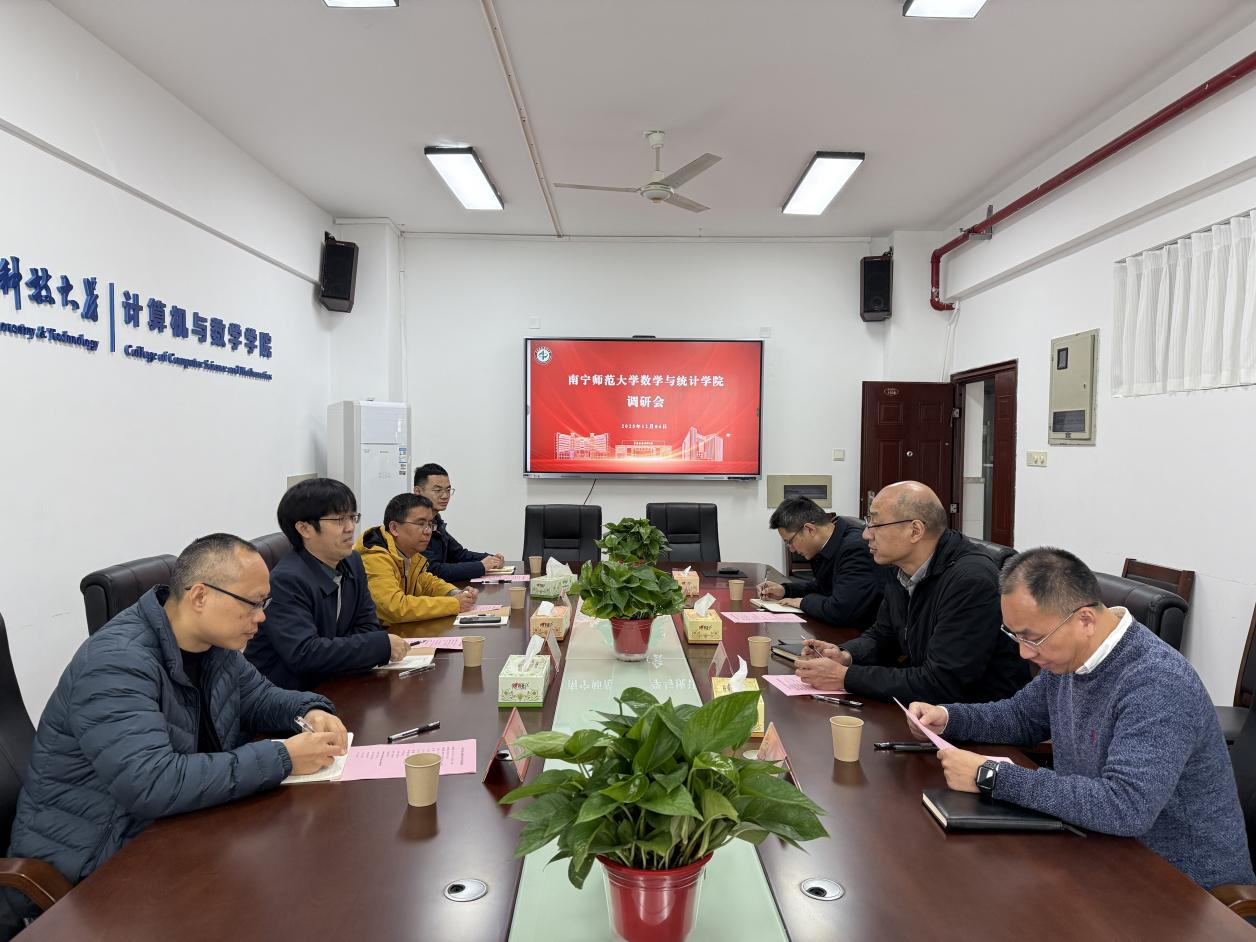 一行表示欢迎,肯定两校过往合作成效,介绍了该校及学院基本情况,结合校史阐述了与广西的渊源、生源及校友联系,并表达了深化数学学科建设交流的意愿。陈红斌副院长分享了师资建设、学科竞赛、青年教师培养等教学工作经验;王传立副院长详解教学与科研融合路径,提出以赛促研、科研反哺教学的实践思路。