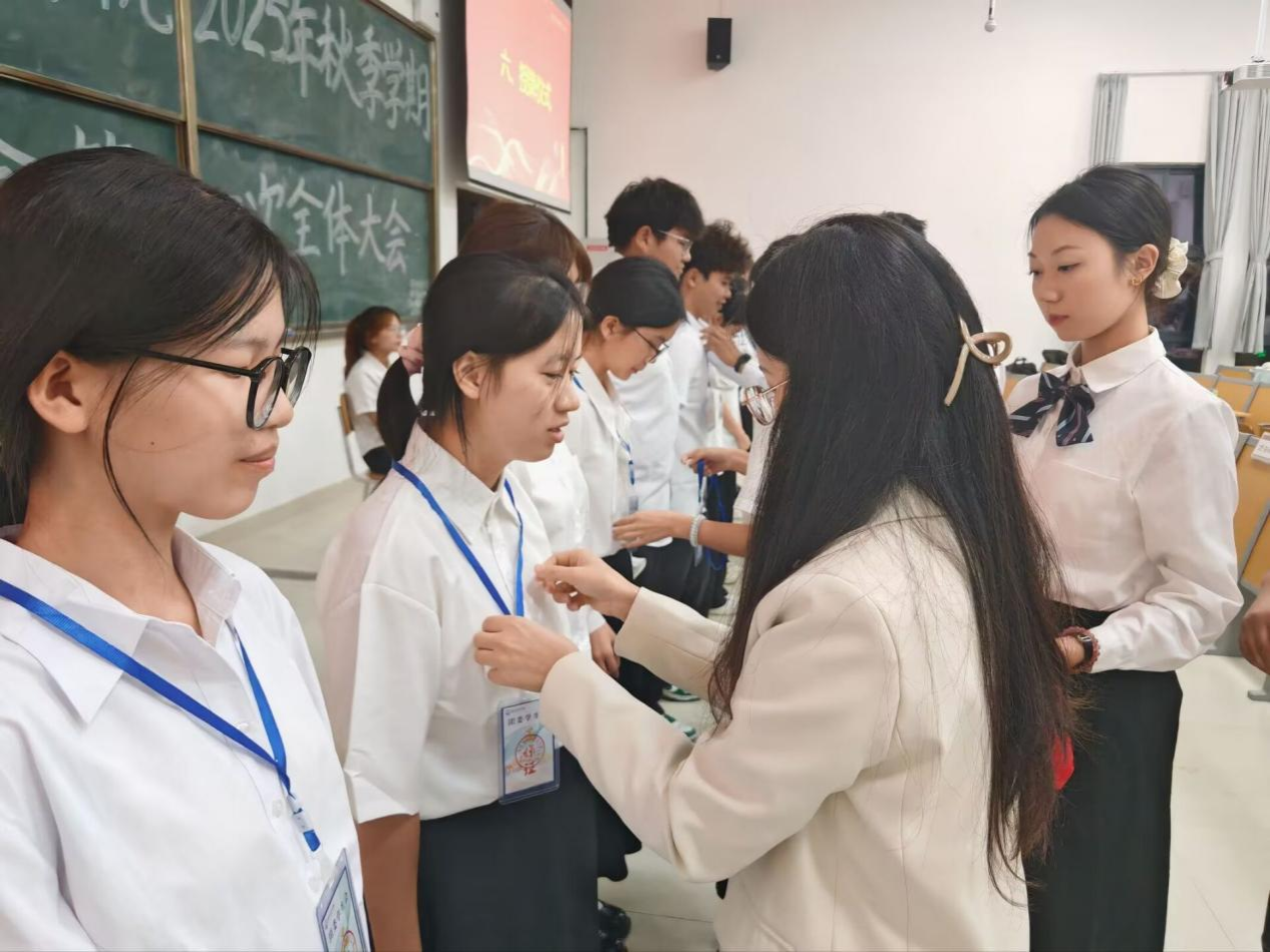 伴随着轻快激昂的音乐,本次大会迎来最振奋人心的授牌仪式。老师们与团委学生会常委团成员亲手为新成员佩戴工作牌,沉甸甸的牌子不仅是身份的象征,更是责任与使命的传递。台下掌声经久不息,不少同学眼中闪烁着激动的光芒,这份认可与鼓励,让大家对未来的工作充满信心。