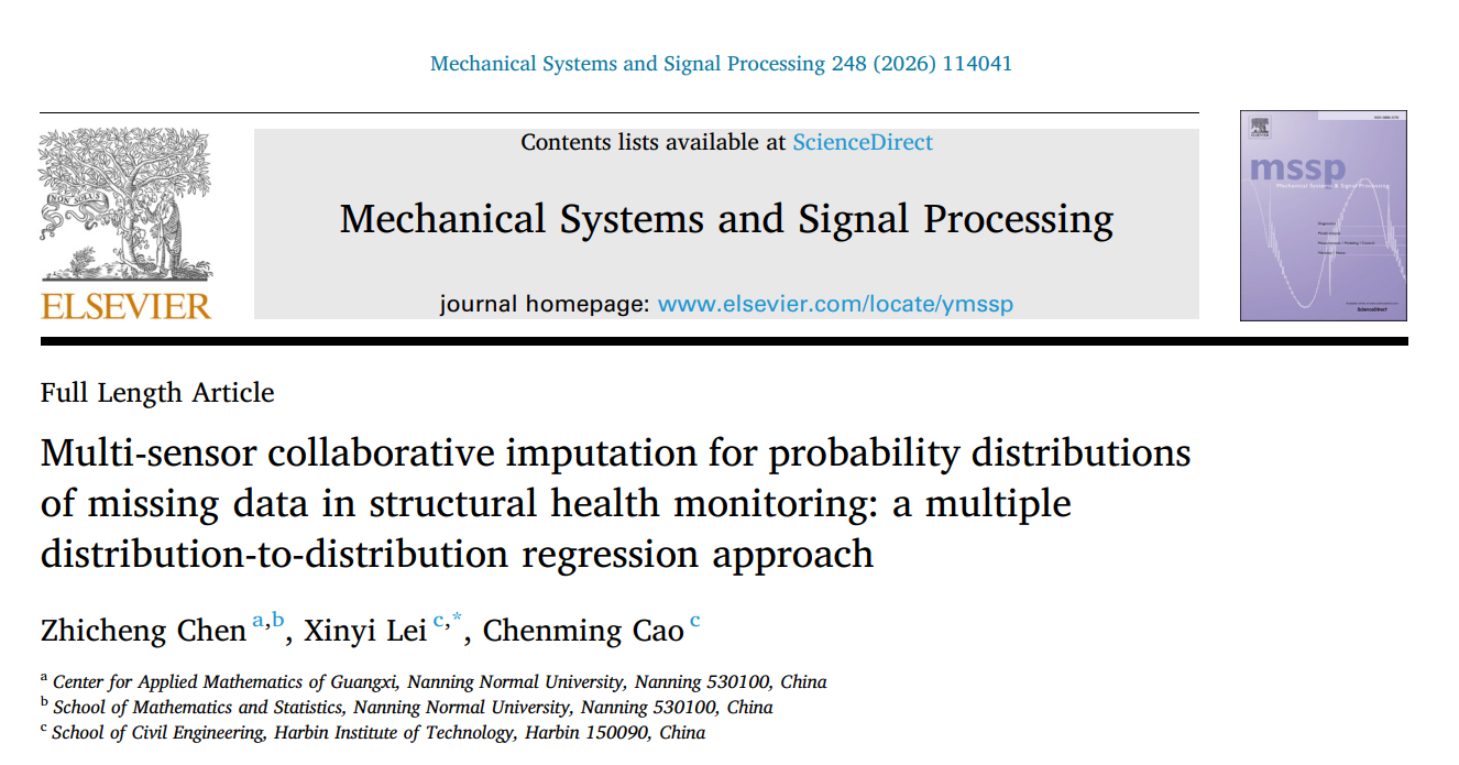 )骨干教师陈智成博士的论文“Multi-sensor collaborative imputation for probability distributions of missing data in structural health monitoring: a multiple distribution-to-distribution regression approach”在工程机械领域一区Top期刊《Mechanical Systems and Signal Processing》(影响因子8.9)上在线发表。