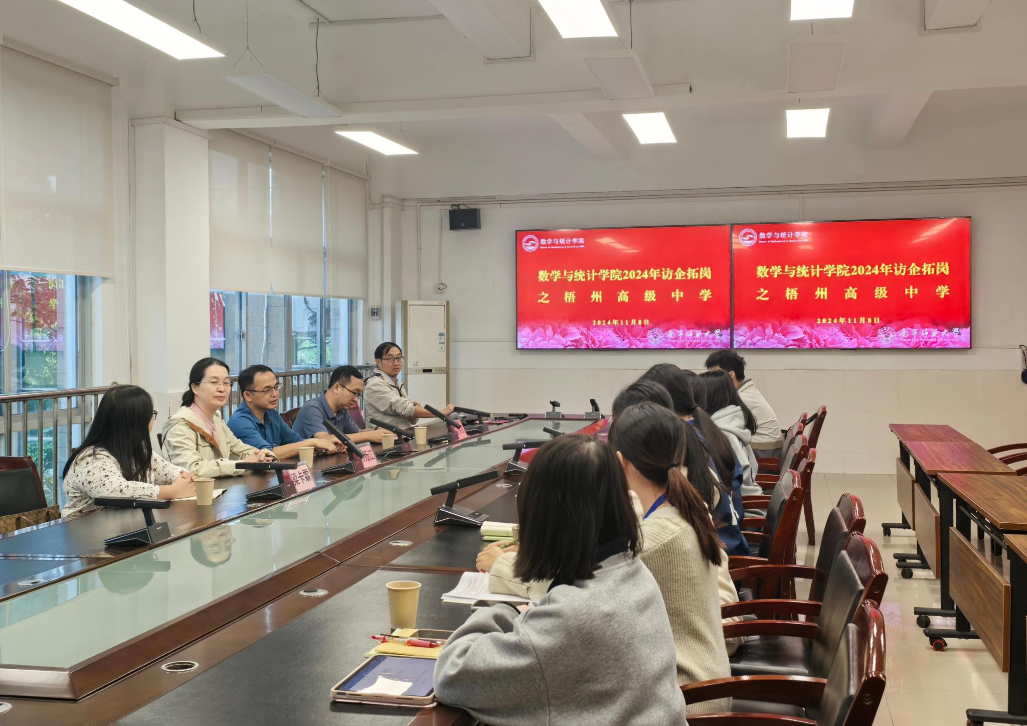 学院今年共有10名2021级数学与应用数学专业毕业生在梧州高中实习,在该校蓝副校长的迎接下,副院长韦扬江同志和梁卡霖老师来到梧州高中会议室进行实习和访企拓岗座谈。座谈中,梧州高中校长谭远森对两位老师的到来表示欢迎,并简要介绍了梧州高中的发展历程、办学特色以及师资需求情况。谭校长表示,梧州高级中学一直注重引进高素质的教育人才,希望能与 girsway