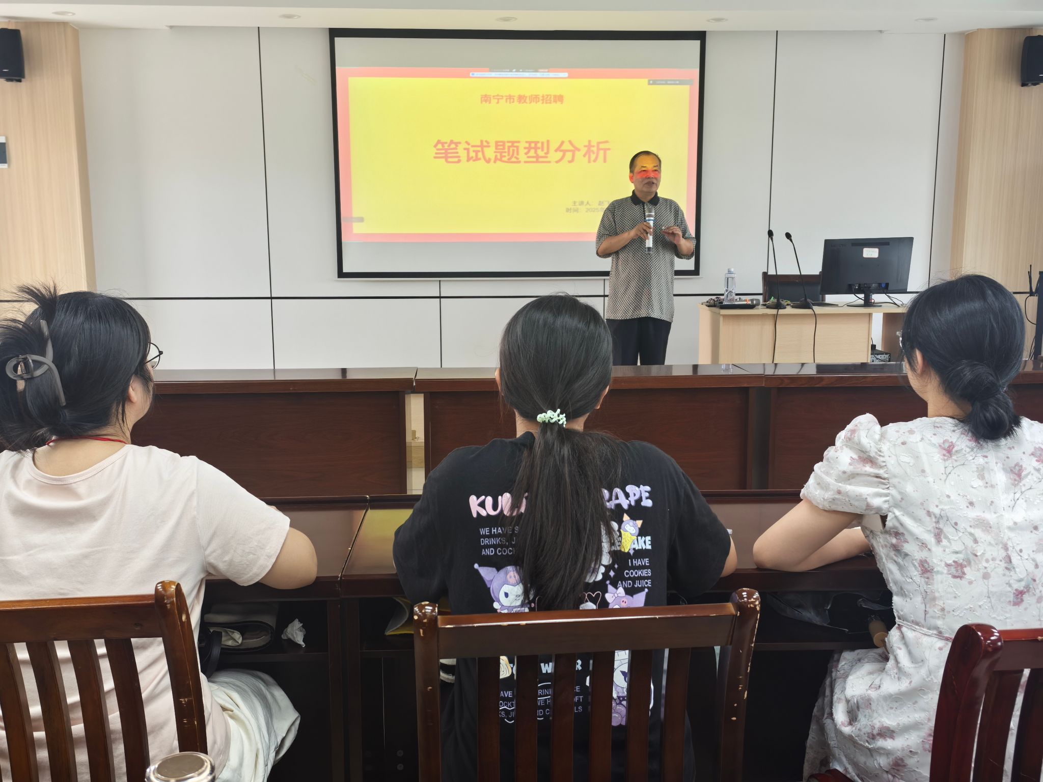 学院通过对2025届毕业生报名南宁市教师招聘情况进行摸底,提前做好需求、困惑等内容的收集,以便更有针对性地开展培训。讲座中,赵飞老师先是围绕近两年南宁市市直属和各城区的教师招聘笔试题型展开深入分析,不仅对各类题型的特点、命题规律进行详细讲解,还精心挑选真题进行解读,传授实用的应试技巧;继而针对毕业生的需求,进行了模拟演练,回应困惑,开展备考指导。培训讲座过程中,参与毕业生认真聆听,积极做好笔记,并就备考过程中的困惑与赵飞老师进行互动交流。