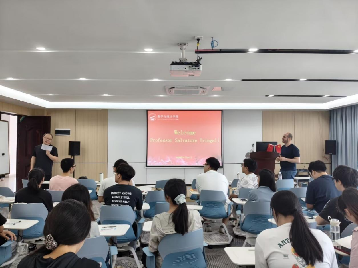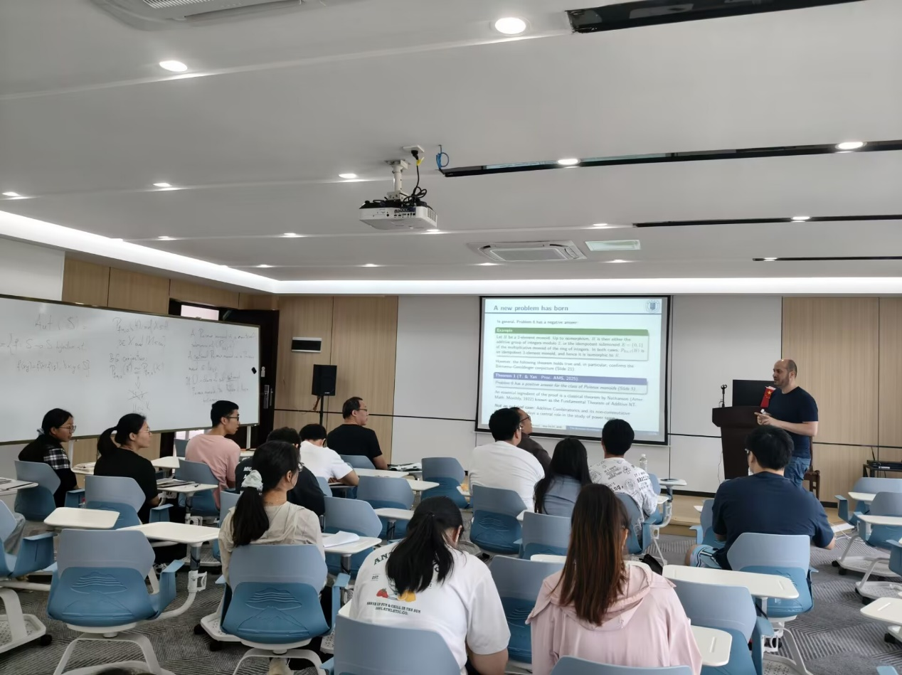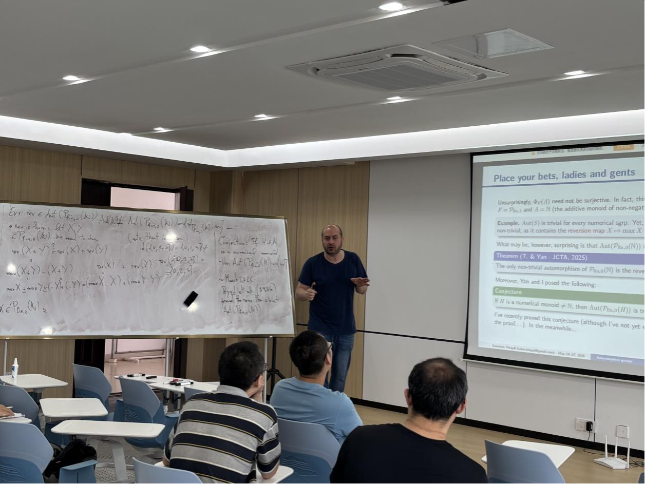 Salvatore Tringali教授长期深耕算术组合学与半群理论交叉前沿方向,主要围绕幂半群、幺半群、代数环等典型代数体系,系统开展非唯一分解性相关专项研究,学术积淀扎实,研究视野开阔,在相关主流研究领域具有良好学术影响力。本次系列报告以幂半群为主线,逐层搭建完备理论框架,先后围绕基础理论体系构建、经典核心问题复盘解析、自同构群前沿研判、幂幺半群算术特征与因子分解刻画、前沿开放课题及未来攻关方向等模块,开展系统化、深层次专题讲授,完整梳理了幂半群领域的发展脉络、应用价值与可拓展研究空间。报告全程采用全英文授课,逻辑缜密清晰、讲解通俗易懂,重难点剖析到位。互动交流环节中,师生全程用英文主动提问、精准对接研讨,围绕核心理论概念、关键科研卡点、创新攻坚路径等内容深入交流切磋,现场学术氛围浓厚热烈。