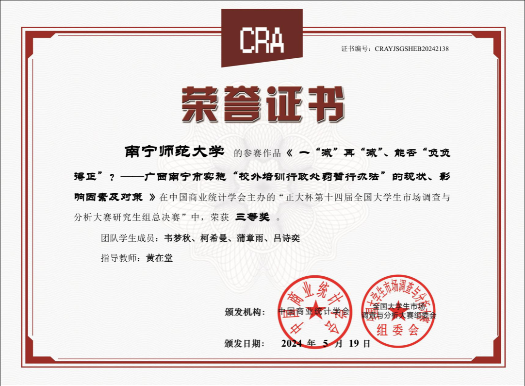参赛队共获得本科组国家三等奖1项、广西一等奖1项、二等奖9项和三等奖2项;研究生组获得国家三等奖1项、广西一等奖3项、三等奖3项。