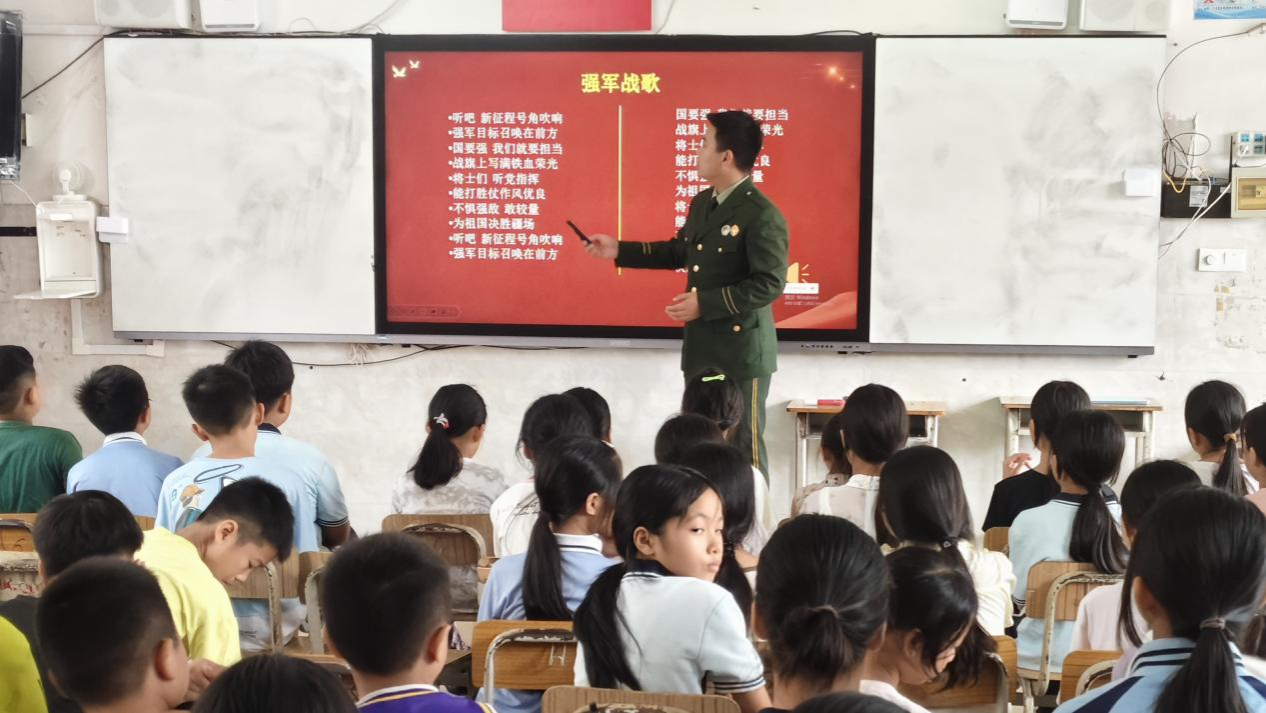 在军事理论宣讲中,实践队员方焦阳以互动游戏开篇,引导小学生们在地图上定位家乡,以生动形式播撒国防种子,迅速点燃课堂热情。随后,他用童趣化语言讲解界碑意义、可疑人员应对等边防知识,小学生们专注聆听、频频互动。情景演示环节里,上台的小学生挺直腰板模仿战士站岗,认真模样赢得阵阵掌声;《强军战歌》的激昂旋律中,嘹亮歌声回荡校园,让小学生们深切感受军人的荣耀。课程尾声的国旗队员选拔中,小学生们在“抬头、挺胸、步伐整齐”的口令下反复练习队列动作,专注神情尽显对国旗的敬畏。