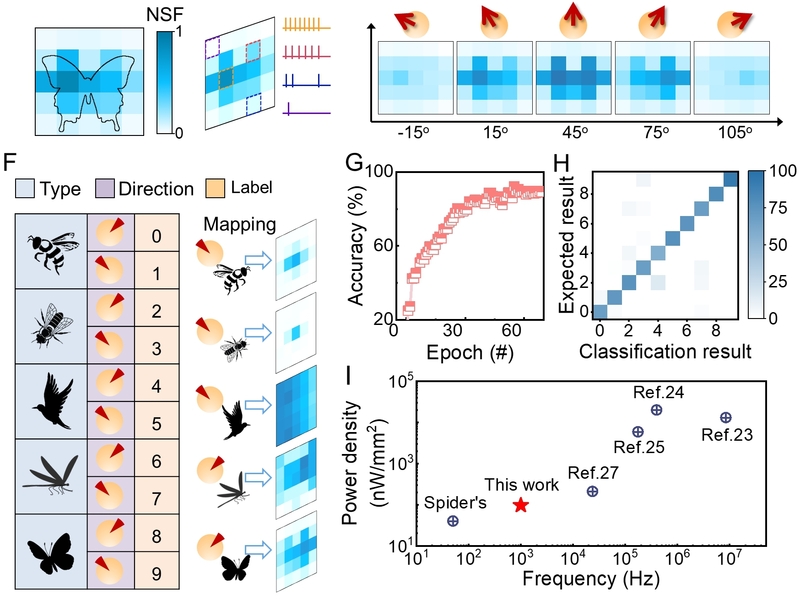 为此,研究团队设计了一种低功率密度的柔性脉冲毛形感受器(FISH),可将微弱的气流信息转化为脉冲序列以实现非接触感知。该感受器的脉冲频率约为500-1500 Hz,功耗约600 nW,单次事件能耗约 660 pJ,与蜘蛛机械感受器性能极为接近。更重要的是,其功率密度低于100 nW/cm2,比已报道的非接触传感设备至少低100倍。我们进一步基于FISH阵列和脉冲神经网络(SNN)构建了非接触触觉感知(NCTP)系统该系统通过群体编码和感受野整合处理气流信息,在非接触目标的多维度(类型与方向)识别中准确率超 92%。作为概念验证,该NCTP系统被集成到蜘蛛机器人中,以验证其在不同环境条件下的适应性。结果表明,蜘蛛机器人实现了持续感知覆盖,不受视觉低能见度限制。该工作将为具身智能和自动驾驶等应用提供新的仿生方案。