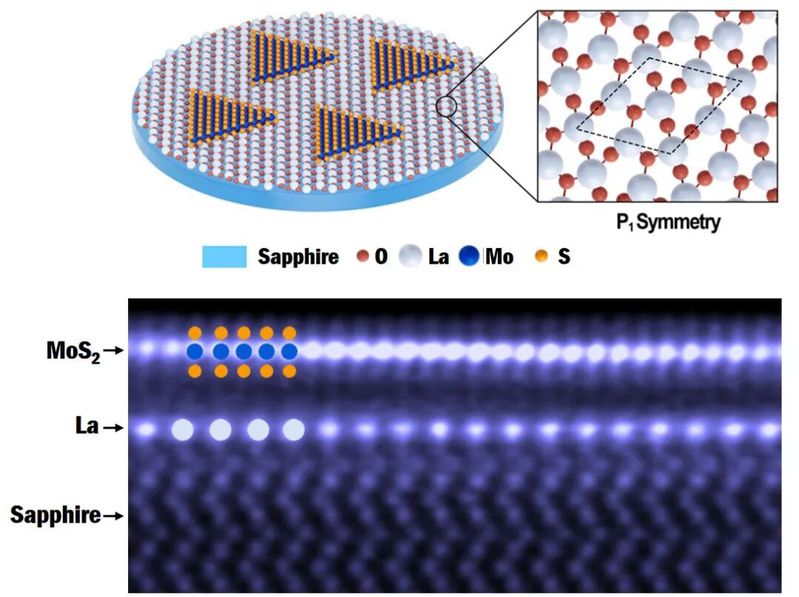 蓝宝石是理想的产业化外延衬底,但由于高对称性,二维半导体存在多个等价方向,拼接时容易产生多晶。该研究的革命性突破在于团队开发的稀土原子表面修饰技术——在蓝宝石表面构建镧单原子层。虽然只有一个原子层的厚度,但是却打破蓝宝石表面固有的对称性,让二维半导体成核锁定在同一个方向上,确保了晶畴的单向排列进而长成单晶。该技术解决了长久以来二维半导体制备存在的重复性、稳定性以及工艺窗口狭窄等局限,适用于多种材料和多种工艺条件。正是这一创新,将普通的蓝宝石衬底“点石成晶”,从根本上解决了二维半导体单晶规模化制备的难题。