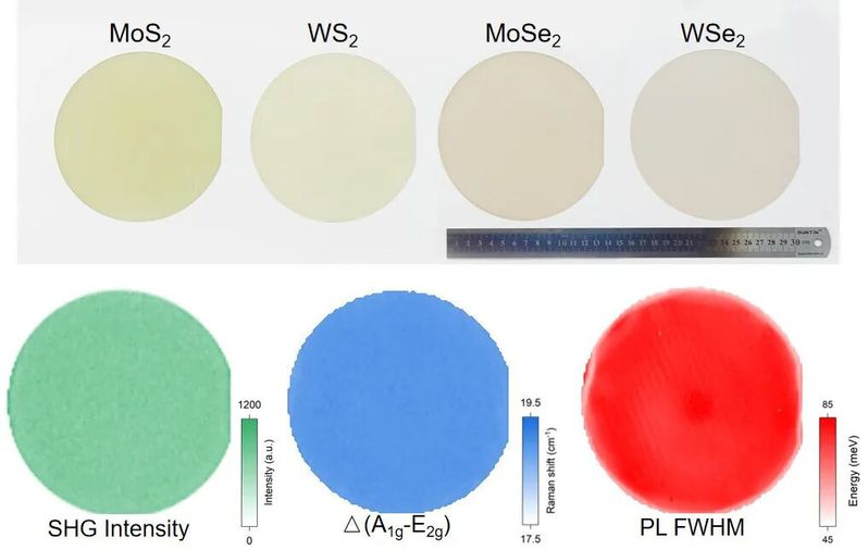 基于量产化的MOCVD技术和镧表面修饰的蓝宝石衬底,团队一举实现了6英寸二硫化钼(MoS2)、二硫化钨(WS2)、二硒化钨(WSe2)和二硒化钼(MoSe2)等二维半导体单晶的普适制备。多种光谱和电学表征技术证实了优异的材料质量和均一性,MoS2和WSe2的平均迁移率分别高达110cm2·V-1·s-1和131cm2·V-1·s-1,单晶尺寸、器件性能同步刷新记录,实现大尺寸与高质量兼得。