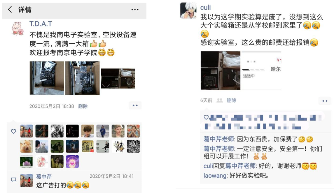 I thought this semester's experimental courses would stop, but I didn’t expect such a big lab box to be mailed from school to my home. Thanks to the lab, the postage was paid back , said Wang Yuanxi of Harbin, Heilongjiang Province. To this, teacher Ge Zhongqin replied , Because things are expensive to add premium. Be safe, safety is the first! Your group can work.